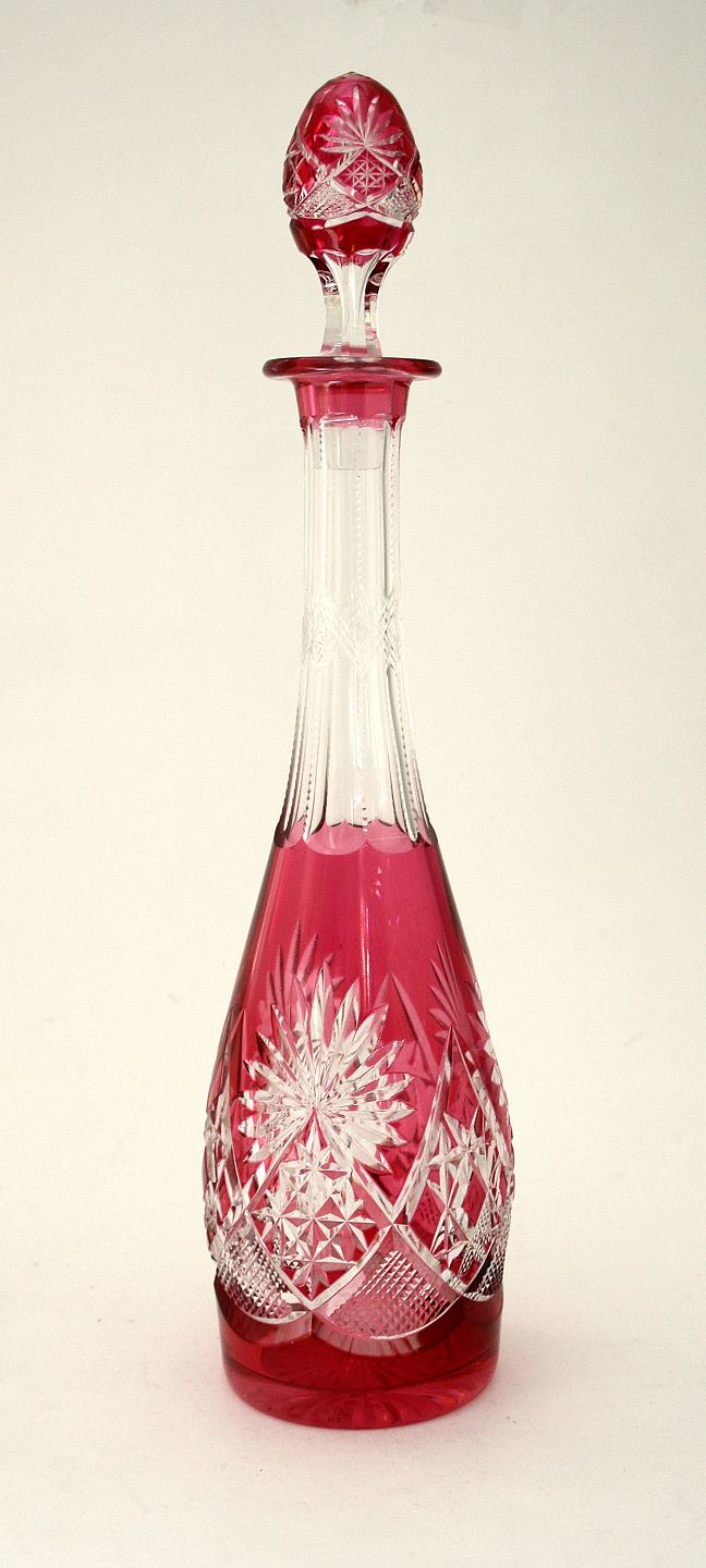 Beskrivelse: Val st. Lambert, Belgien, rød krystal karaffel med flotte slibninger. signeret Val st. Lambert. Højde 41 cm. Flot stand. Pris: SOLGT
