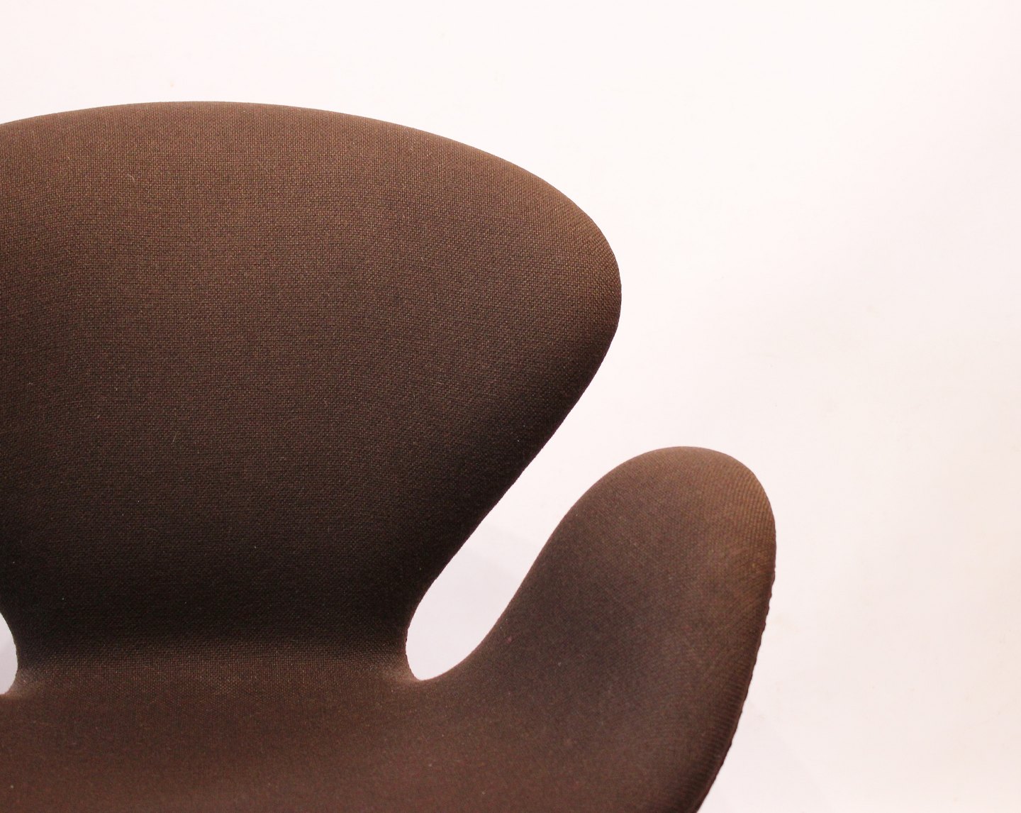 Beskrivelse: Svane stolen, model 3320, og skammel model 3127, designet af Arne Jacobsen i 1958 og fremstillet af Fritz Hansen i 2001 og 2003. Begge er polstret i mørke brunt uldstof og i flot brugt stand.