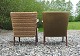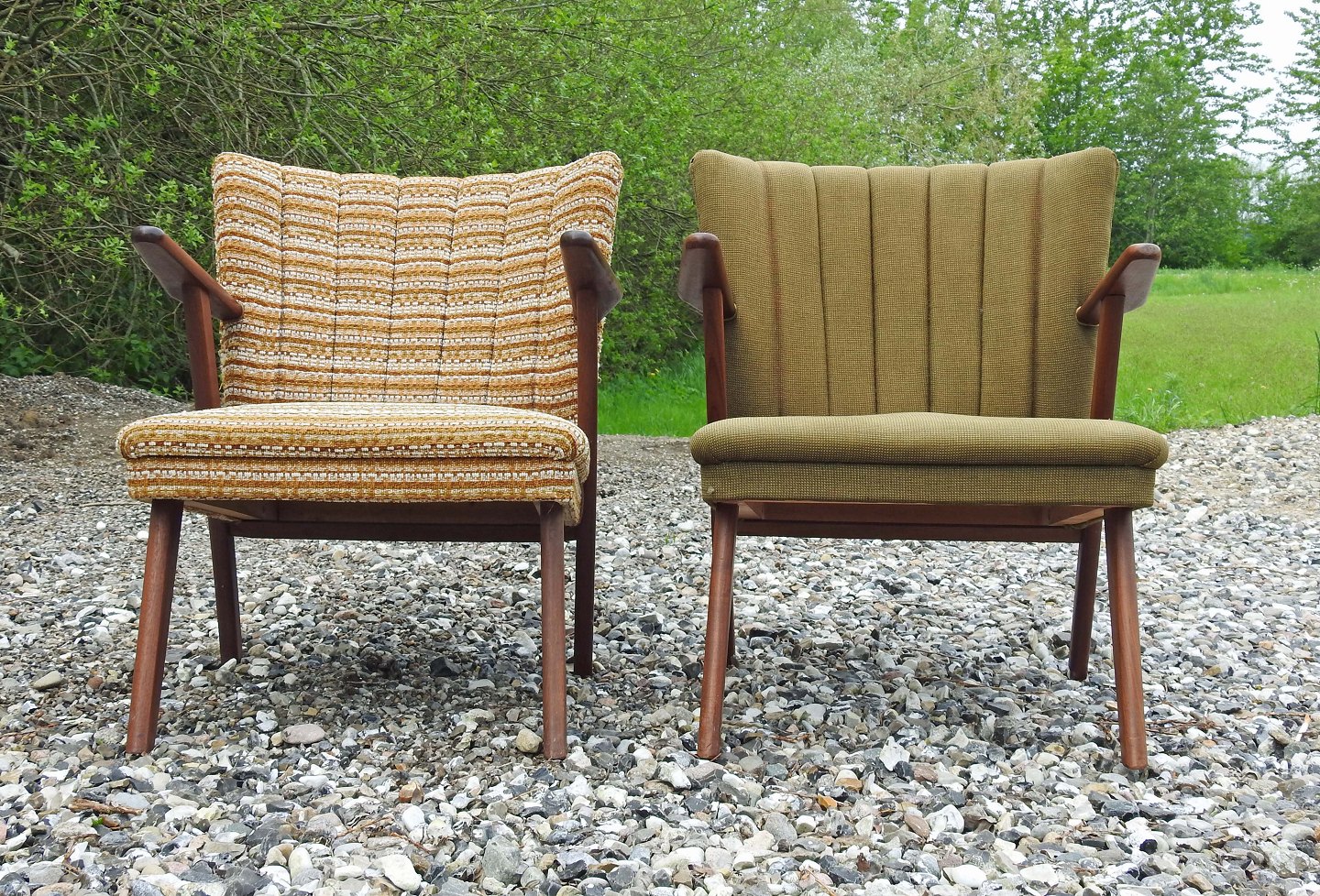 Beskrivelse: Et sæt lænestole med stel i teaktræ og polstret sæder i grønt og gyldent stof