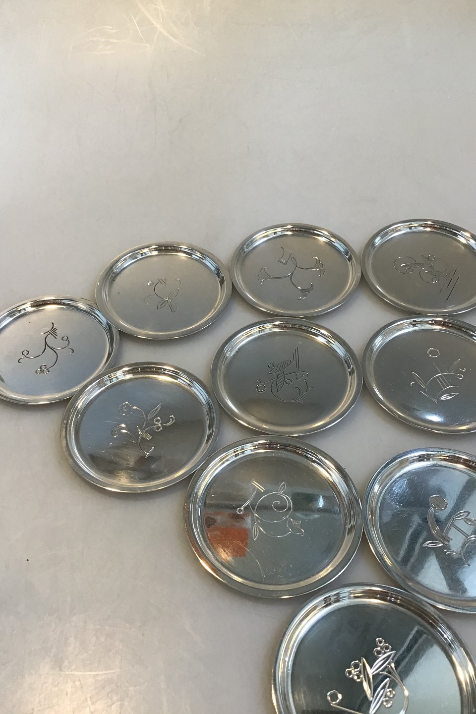 Description: F Hingelberg Sterling Silver Coasters(1931-32) Set of 13 coasters with stylized floral decorations Diam 7.5 cm( 2.95 in) Combined weight 556 gr/ 19.61oz