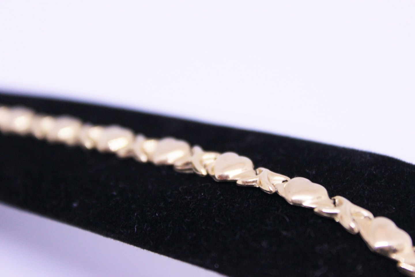 Description: Bracelet of 14 carat gold decorated with hearts and stamped BEE.