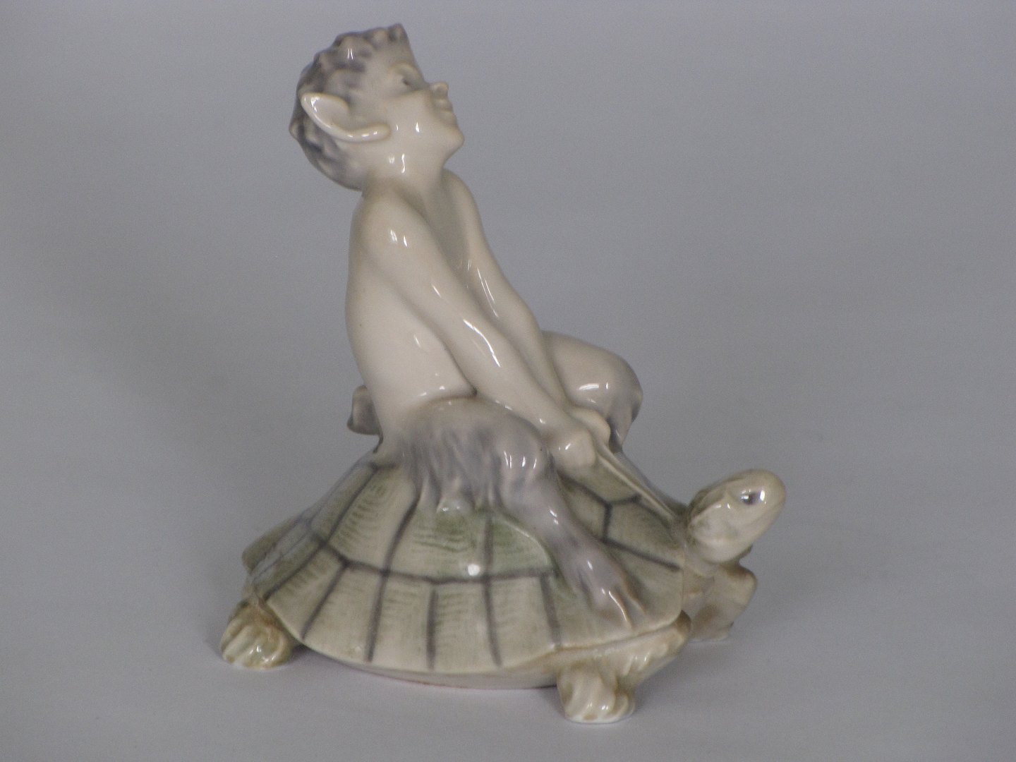 Description: Figurine Nr. 858 faun on turtle artist Chr. Thomsen from Royal Copenhagen. Heigh ca. 10 cm. 1. sorting