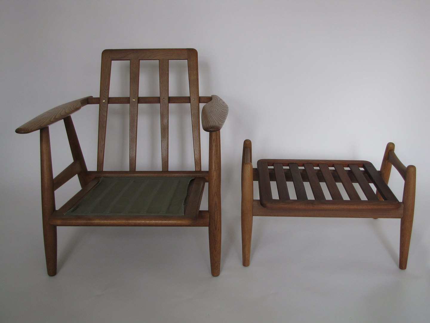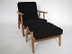 Beskrivelse: Hans J. Wegner lænestol designet i 1954. Lænestol af patineret egetræ og skammel af patineret eg og teak. Sæde ryg samt skammel hynde ny polstret med sort uld stof fra Kvadrat. Stol og skammel produceret hos GETAMA.