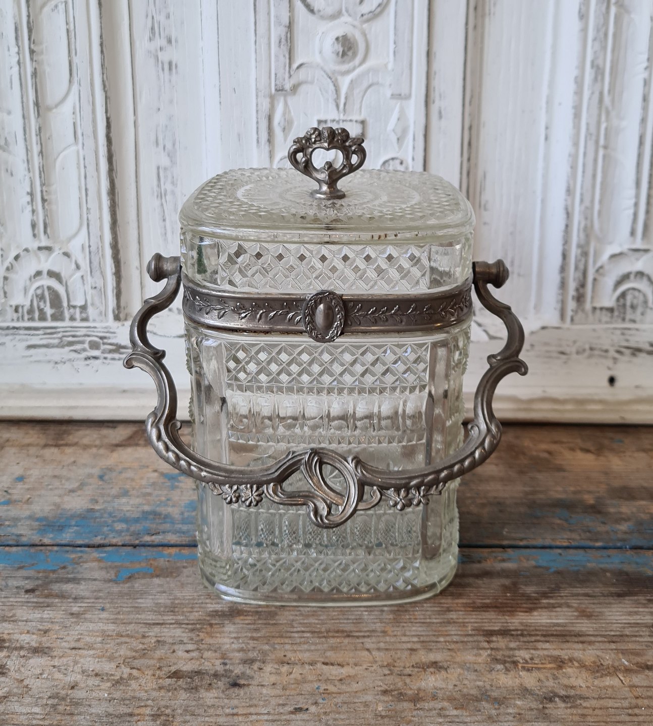 Beskrivelse: Smuk gammel kiksespand i presset glas med tin montering