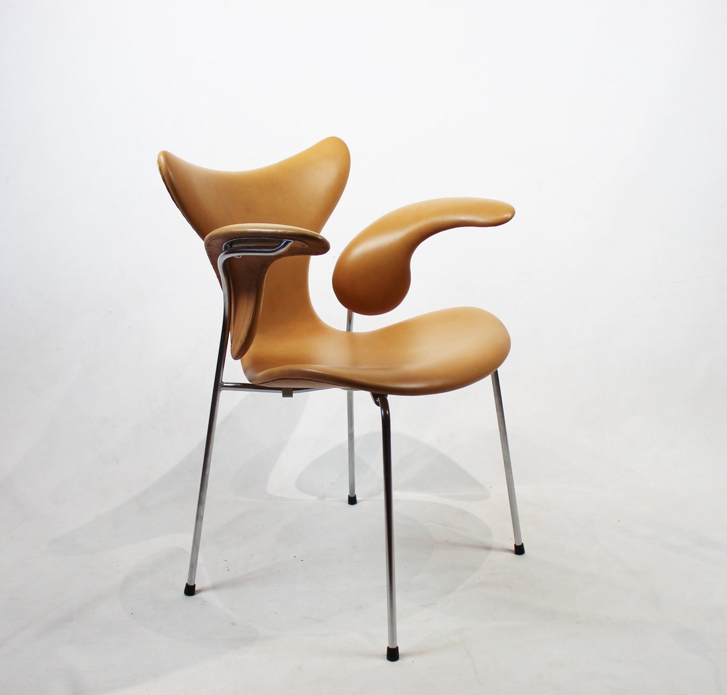 Description: The lily, model 3208, with armrests was designed by Arne Jacobsen in 1970 and manufactured by Fritz Hansen in the same year. This chair is a classic example of Jacobsen's ability to create functional furniture with a sculptural aesthetic.