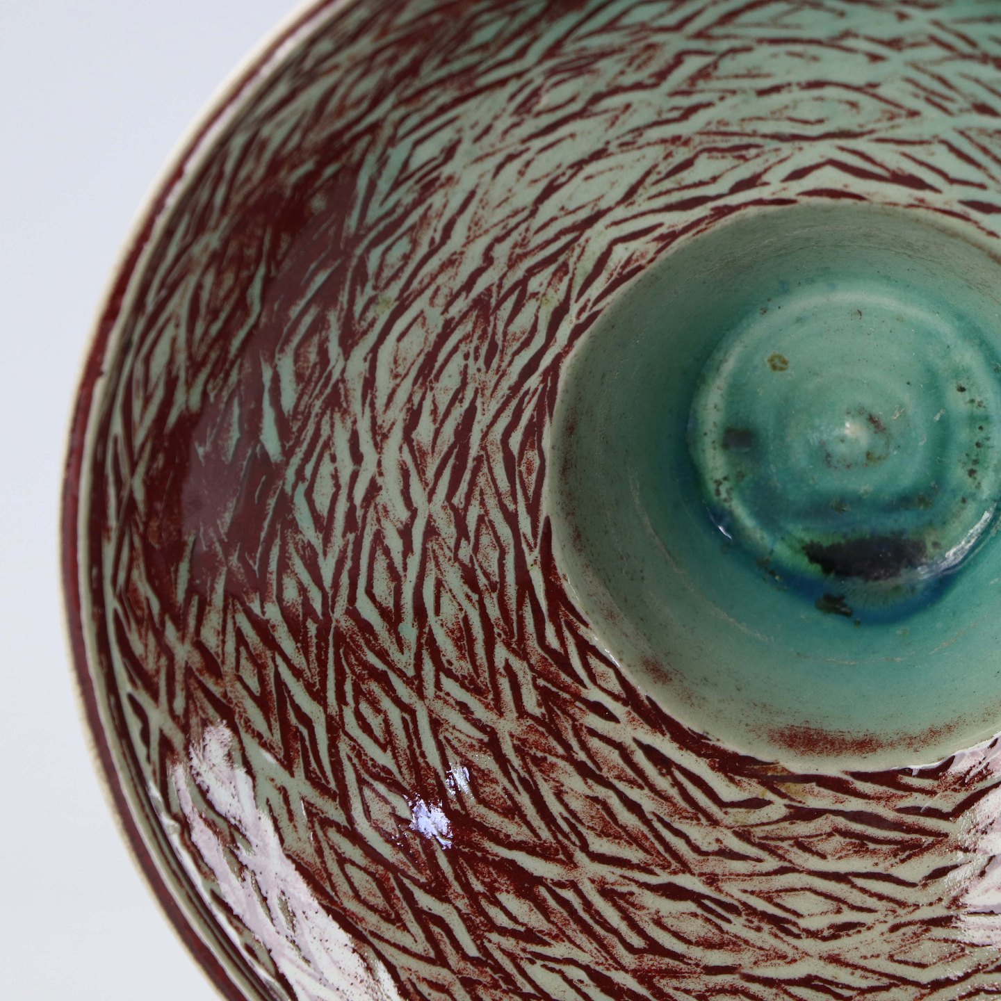 Beskrivelse: Skål i keramik med mønstret glasur i røde og blågrønne nuancer