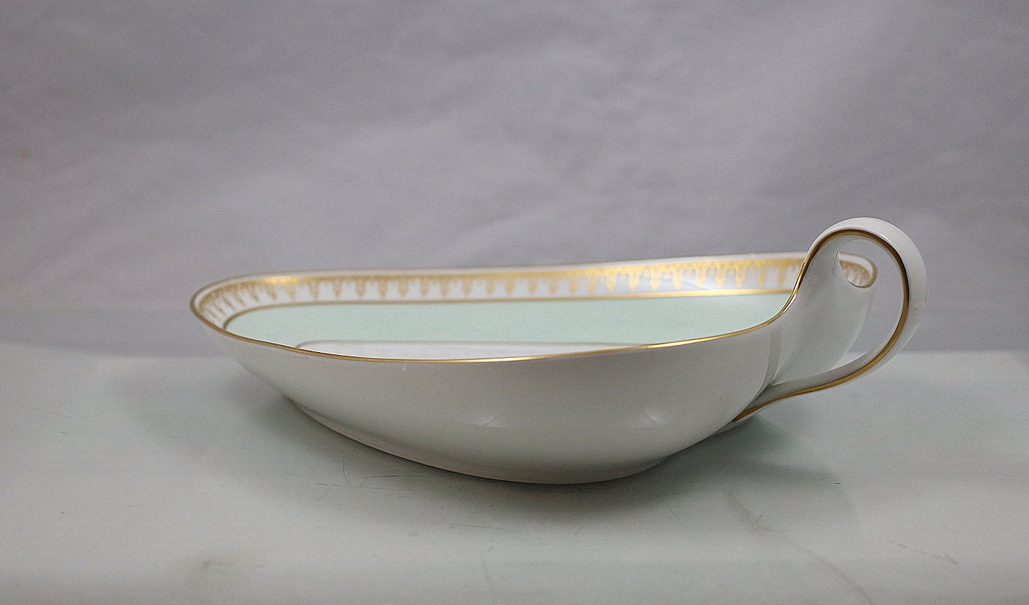 Thorvaldsen er hvidt porcelæn dekoreret med bred sart grøn bort og omkranset af guldstafferinger