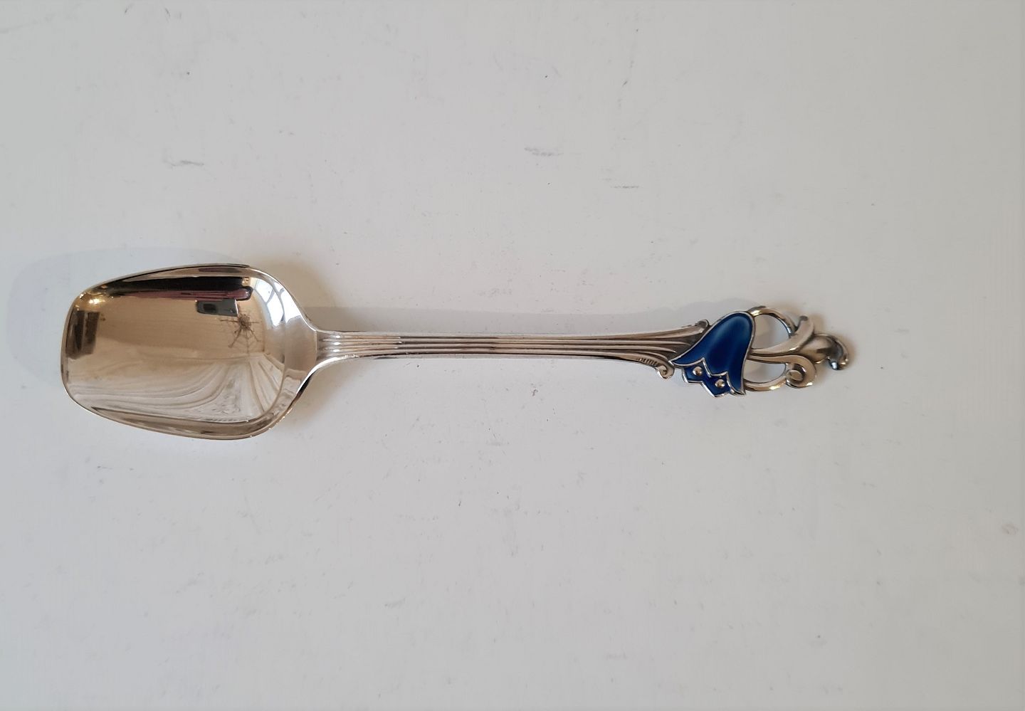 Marmalade spoon in Norwegian silver decorated with bell flower in blue enamel by TH.Marthinsen 14 cm.