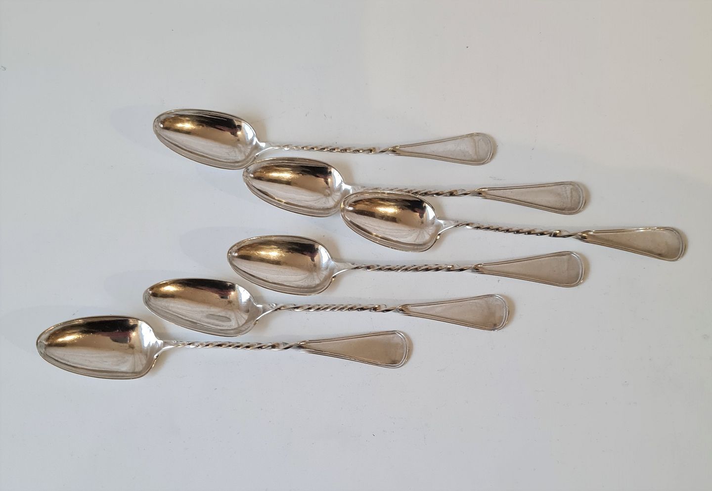 Beskrivelse: Sæt på 6 teskeer i sølv - dobbeltriflet med snoet skaft.