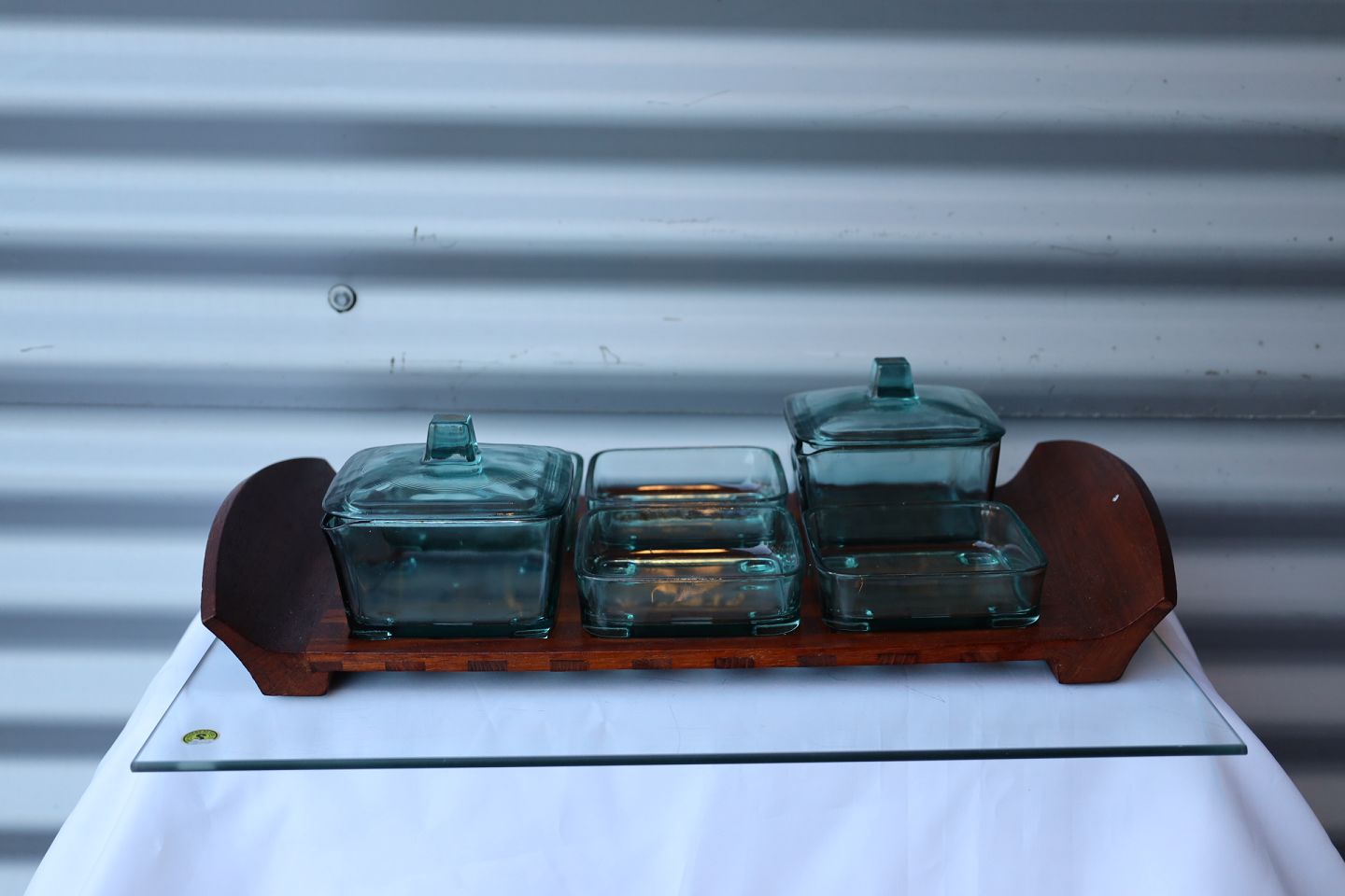 Beskrivelse: Jens Harald Quistgaard = IHQ. Dansk Design. Vintage bakke, i teak træ, med 6 glasskåle, 2 af skålene har hælde tud og låg. De 6 skåle er grønlige, hver skål har "fødder" der passer i bakkens gitter. Bakken er designet 1960`erne.