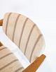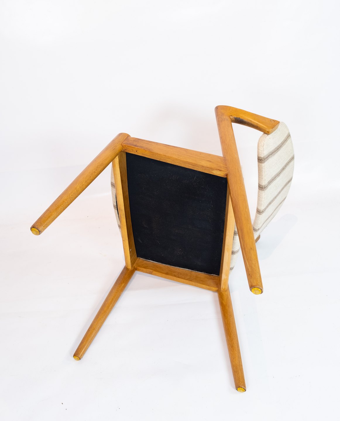 Beskrivelse: Et sæt af 6 spisestuestole, model 42, designet af Kai Kristiansen og fremstillet hos Schou Andersen i 1960erne. Stolene er af eg og polstret i lyst stribet uldstof. Stolene vil blive efterset på værkstedet inden levering, samt ompolstret hvis ønsket for ekstra betaling.