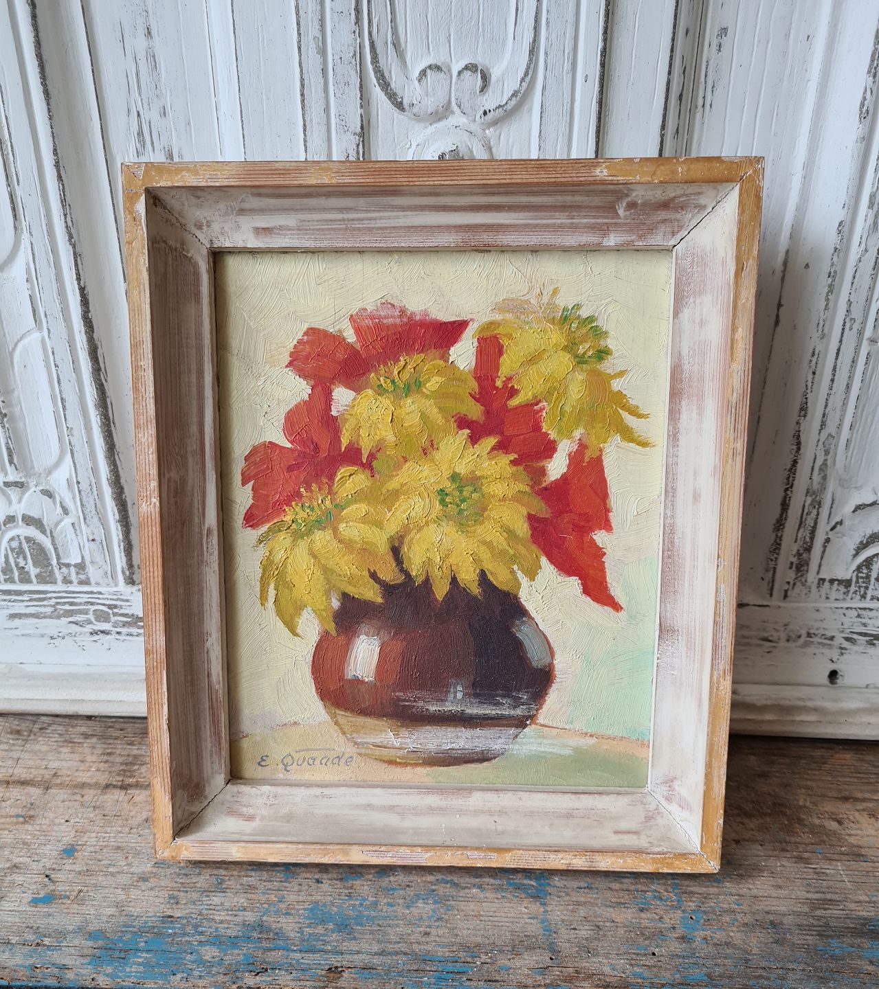 E.Quaade lille maleri - olie på plade. Blomster i vase fra 1954