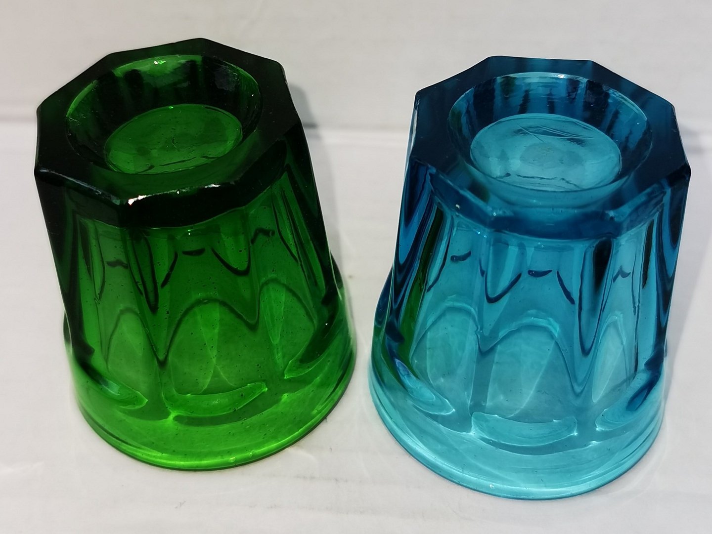 Beskrivelse: Grønt (SOLGT) og blåt børneglas fra Fyens Glasværk. Fremstår i god stand. H. 5½ cm.