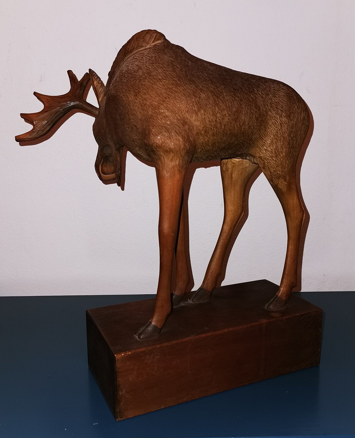 Beskrivelse: Figur af elg håndskåret i træ. Signeret af den finske billedhugger V. Niemnien på bagsiden af basen. Udført omkring 1970. I god stand. Ingen skader eller reparationer. Figurens gevir er løse. Mål: 31 cm høj (12,20 inches) Basen måler: 9½ x 20½ cm (3,74 x 8,07 inches).