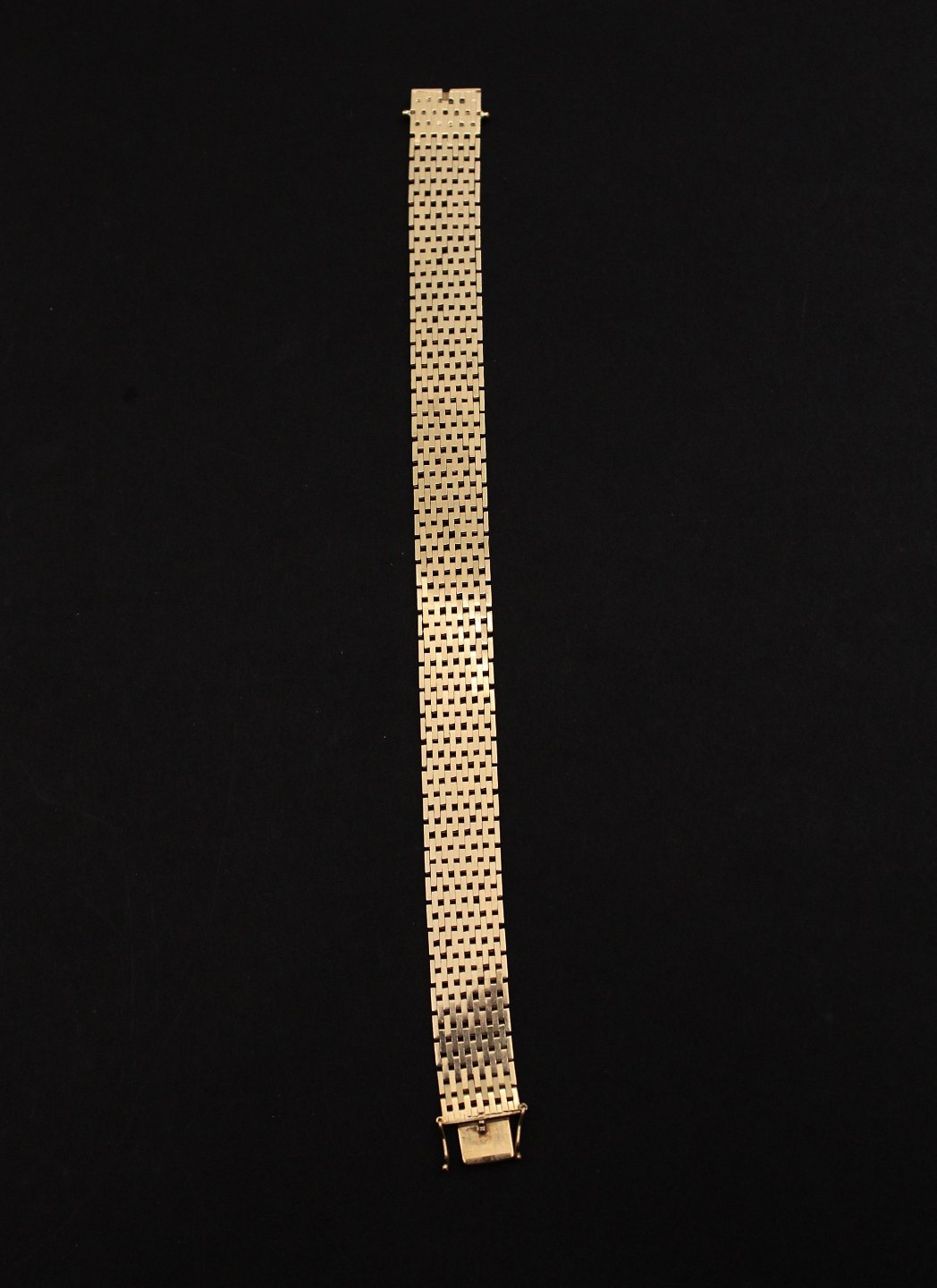 Beskrivelse: 14 karat guld armlænke 18,5 cm. B. 1,3 cm. 30,8 gram fra guldsmed Tom Søgård Jensen København emne nr. 495346