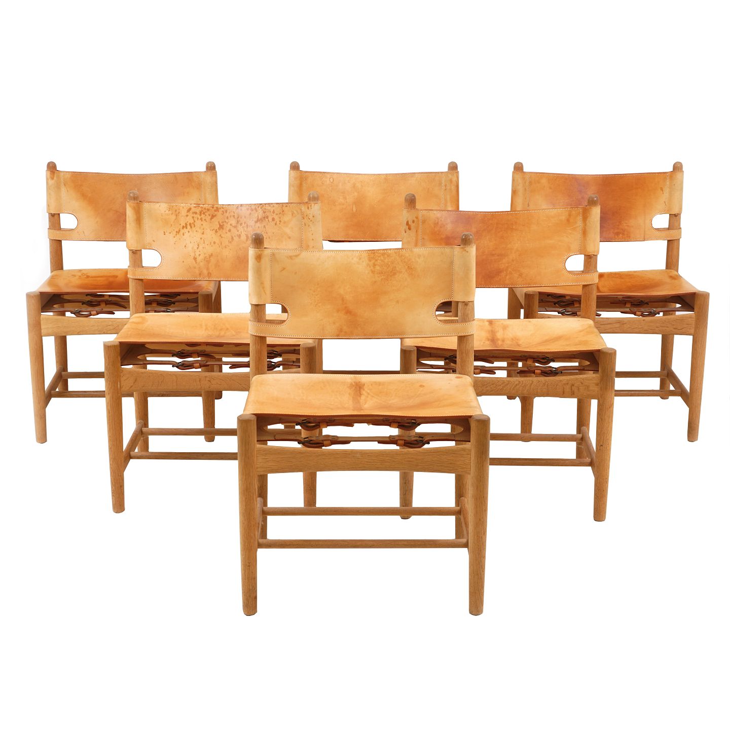 Børge Mogensen 3237. Sæt på seks jagtstole / Den Spanske Spisebordsstol i eg med patineret kernelæder. Fremstillet af Fredericia Furniture og med label herfra. Model 3237