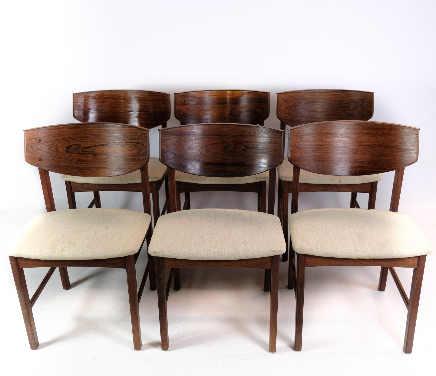 Description: Set of six dining chairs in rosewood with light fabric of Danish design from around the 1960s.