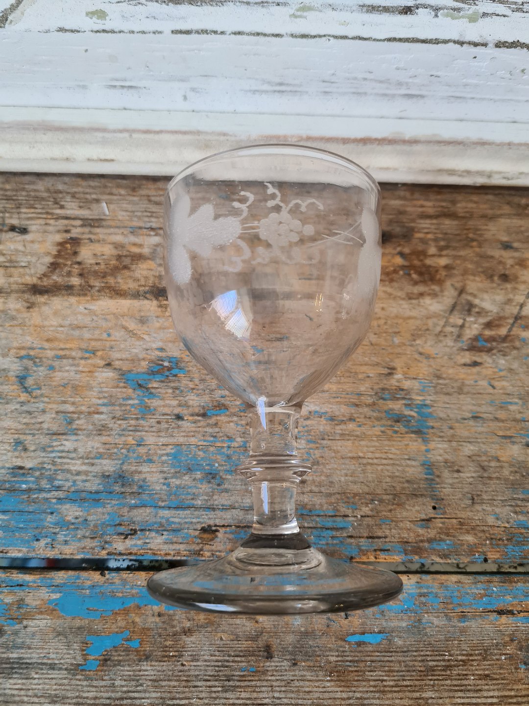 Beskrivelse: 1800tals dansk vinglas på stilk med knap, dekoreret med matslebet vinløvsranke med 3 drueklaser