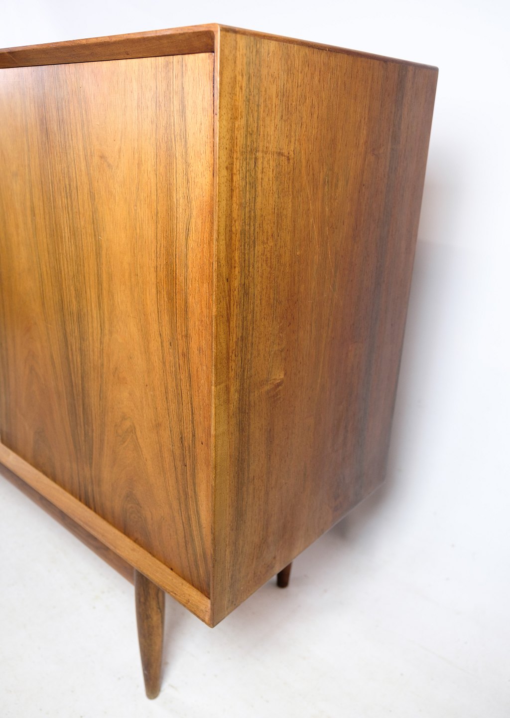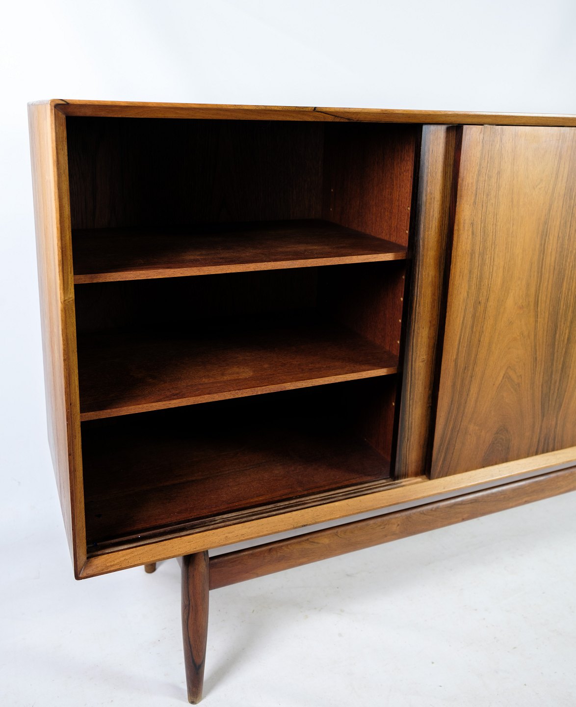 Description: This tall sideboard in rosewood is a magnificent example of Danish furniture design from the 1960s. The beautiful rosewood, which is known for its rich color and unique seasonal patterns, gives the sideboard a warm and inviting radiance. Every detail is carefully executed, which reflects the high quality and fine craftsmanship that characterizes Danish design at this time.