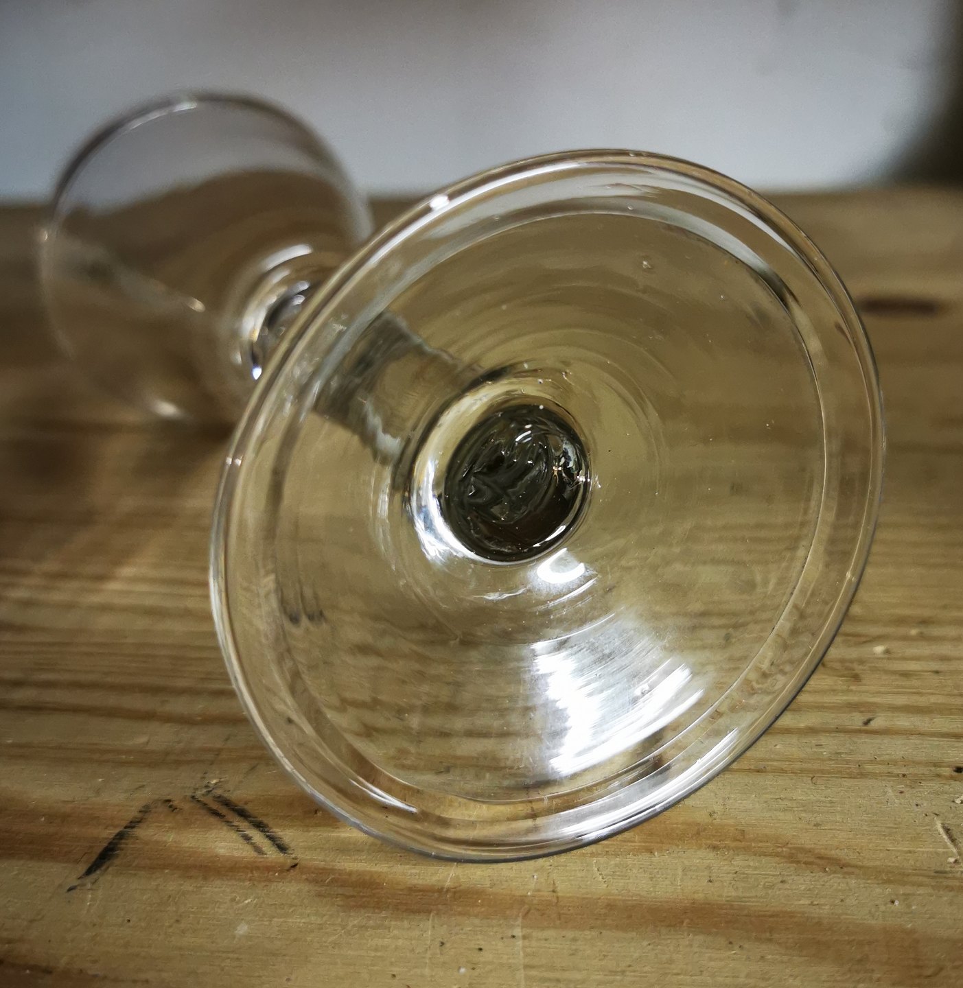 Beskrivelse: Vinglas på stilk. Såkaldt "Nøgen Jomfru" fra omkring 1800. Ombukket fod. Fremstår i god stand uden skader eller reparationer. H. 16 cm