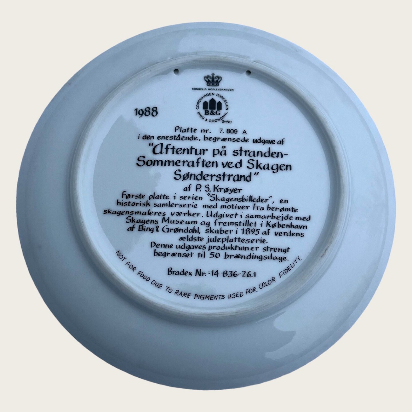 Beskrivelse: Bing & Grøndahl, Skagensmalerne, 1988, Platte nr. 1, “Aftentur på stranden”, P.S.Krøyer *Perfekt stand*