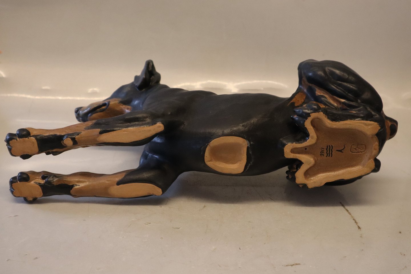 3911 RC Aluminia Faience Dobermann 16.5 x 38 cm Jeanne Grut Royal Copenhagen Aluminia Faience figurine. Dog Figurine Dobbermann Pinscher
