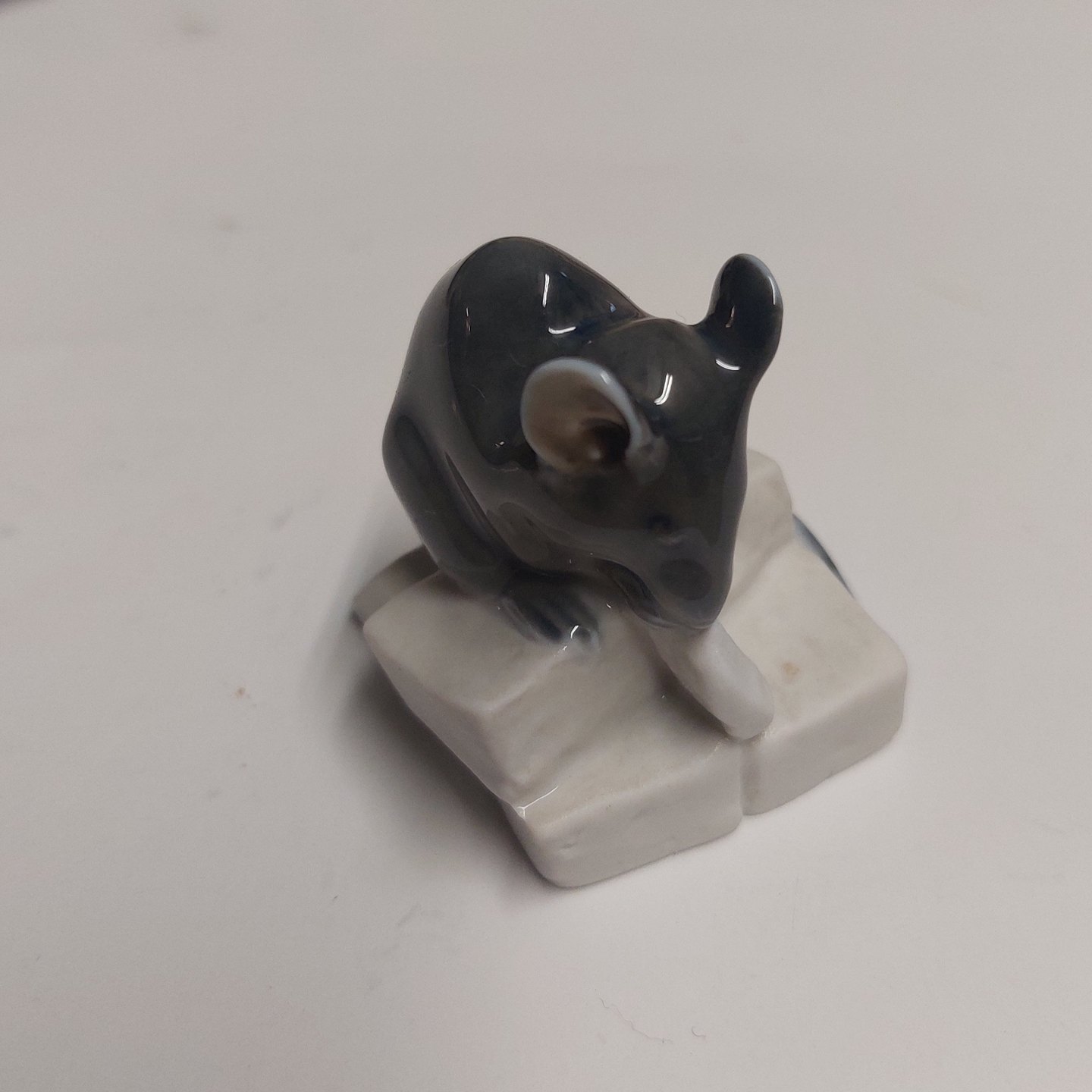 Description: Figure of a mouse on a piece of sugar or lump of sugar. Produced at Royal Copenhagen. Model number 510. Designed by Erik Nielsen. Factory mark on the bottom. First quality production. No damage or repairs. H. 4 cm.