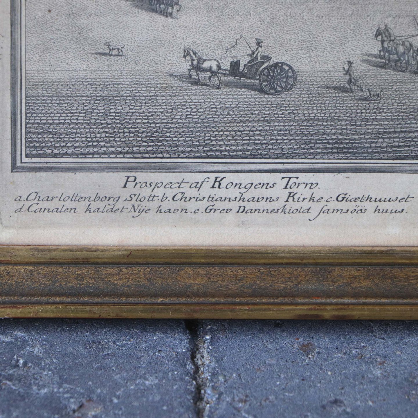 Beskrivelse: Indrammet tryk monteret i gylden ramme. Gammelt bogtryk med titlen Prospect af Kongens Nytorv med motiv af område i København med udsigt til Nyhavn, Christianshavn Kirke, Charlottenborg slot, Grev Dannerskjold huset