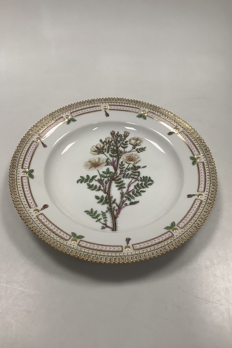 Beskrivelse: Royal Copenhagen Flora Danica Spisetallerken No. 624 (20/3549) Måler Diam 26 cm. (10.23 inch) 1. Sortering. Latinsk Navn: Rosa impinelleafolia L.