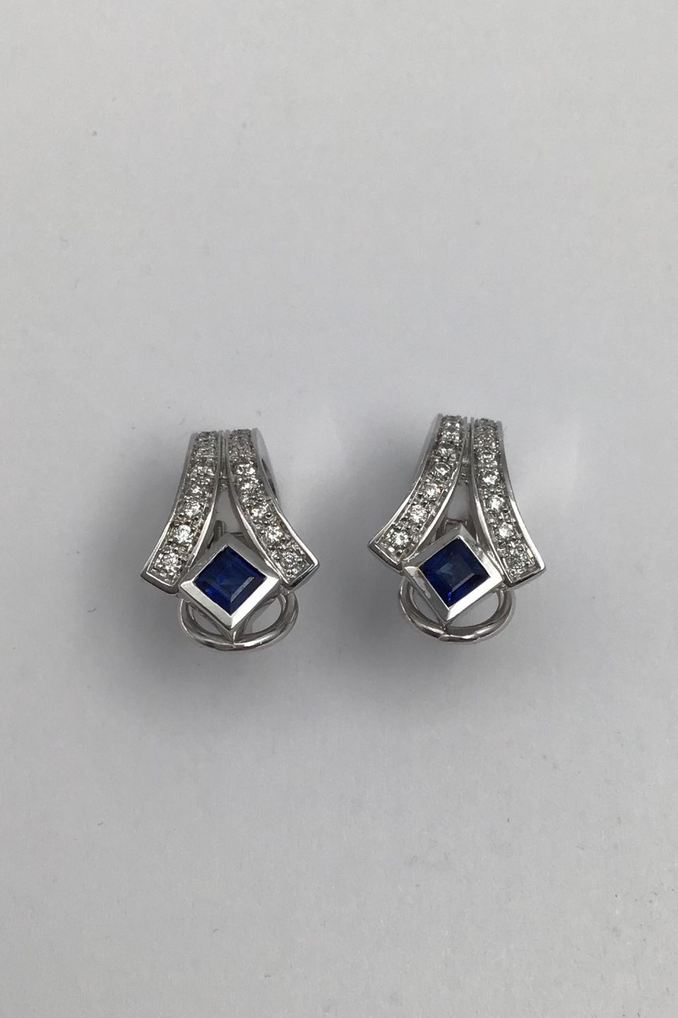 Description: Danish 14 K Whitegold Ear Studs w Saphir & Diamonds Measures 2 cm x 1.2 cm (0.78 inch x 0.47 inch) Combined Weight 9.3 gr (0.33 oz)