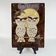 Beskrivelse: Fliserelief med motiv af to ugler og fuldmåne på brun baggrund. I de øverste hjørner er der huller til ophæng