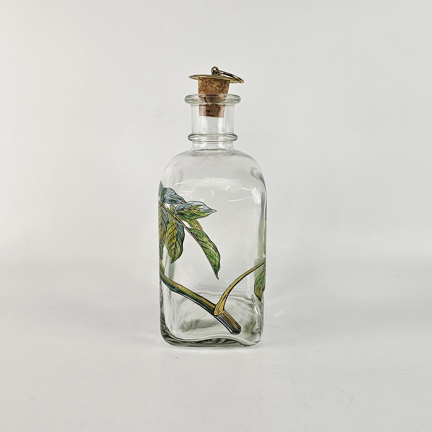Beskrivelse: Firkantet glaskaraffel med buet top og tilhørende korkprop. Dekoreret med valnøddegren, der slynger sig om karaflen og teksten Juglans regia L.