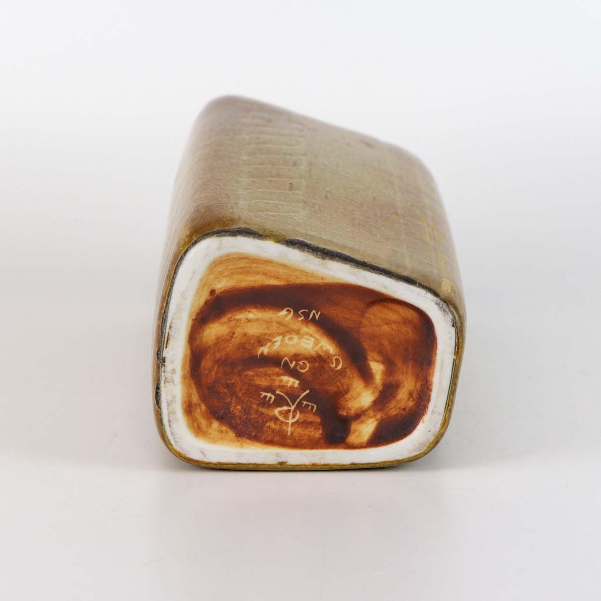 Beskrivelse: Asymmetrisk kantet vase i stentøj med gulbrun glasering og stuktur