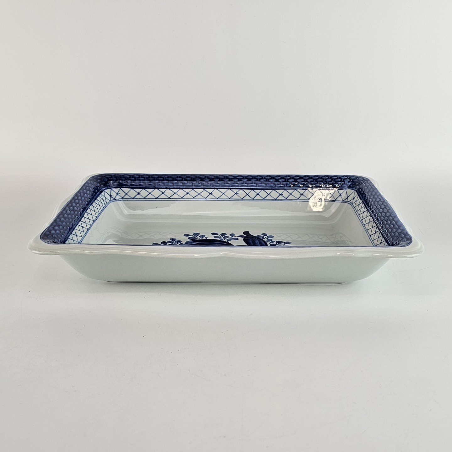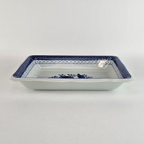 Beskrivelse: Rektangulært fad i fajance fra stellet Blå Tranquebar nr. 11/1207