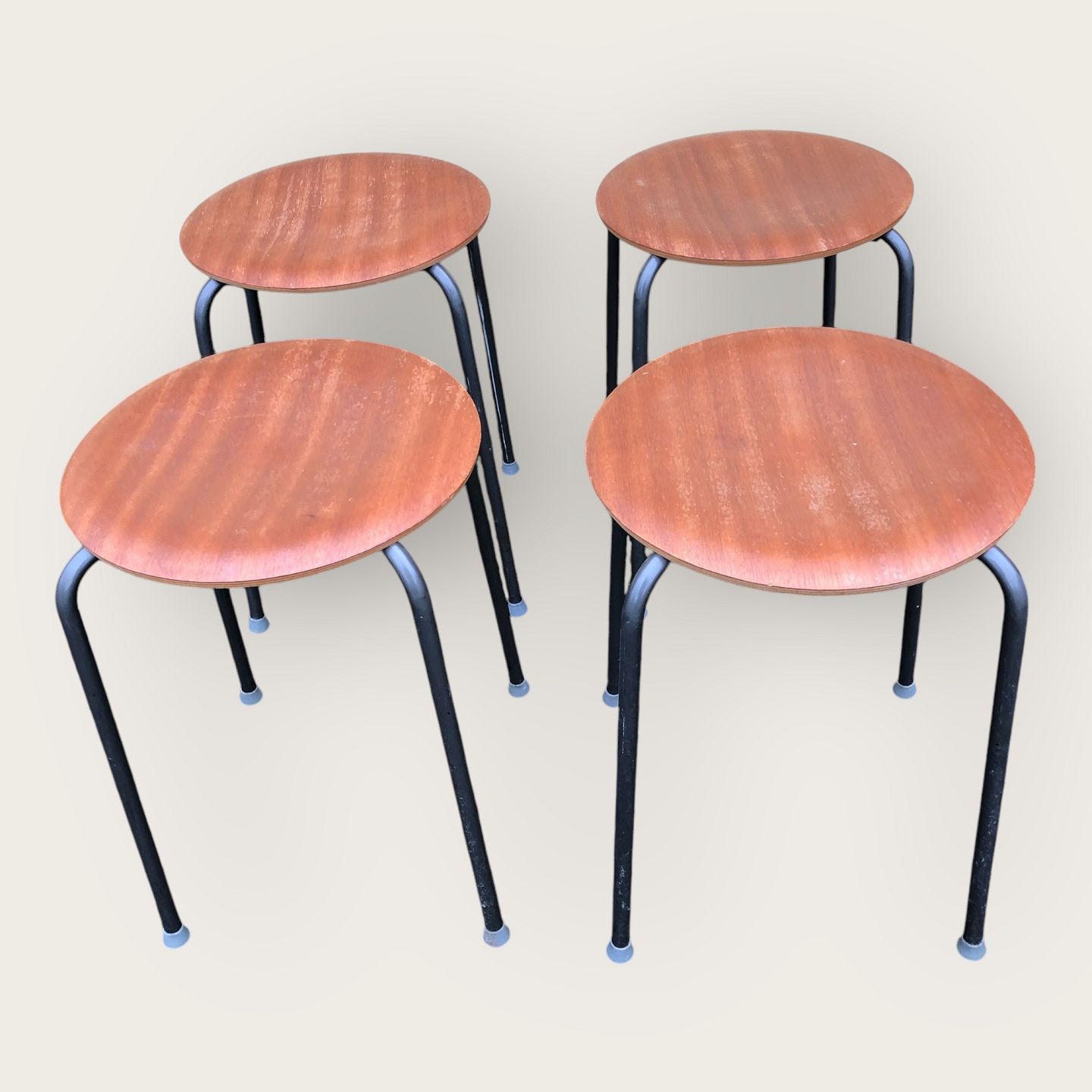 Description: Stool / Stool with teak veneer seat and 4 steel legs, Brand: Made in Denmark, Danish modern from the 1960s, Height 45cm, diameter 32.5 cm, appears in good condition with few signs of wear.