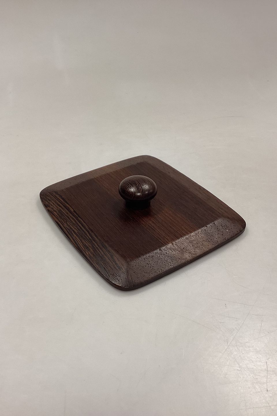 Beskrivelse: Bing og Grøndahl / Kronjyden Relief Trælåg til skål med hanke. Design: Jens Quistgaard. Måler 17,8 cm x 16 cm. Låget er i wengé træ.