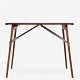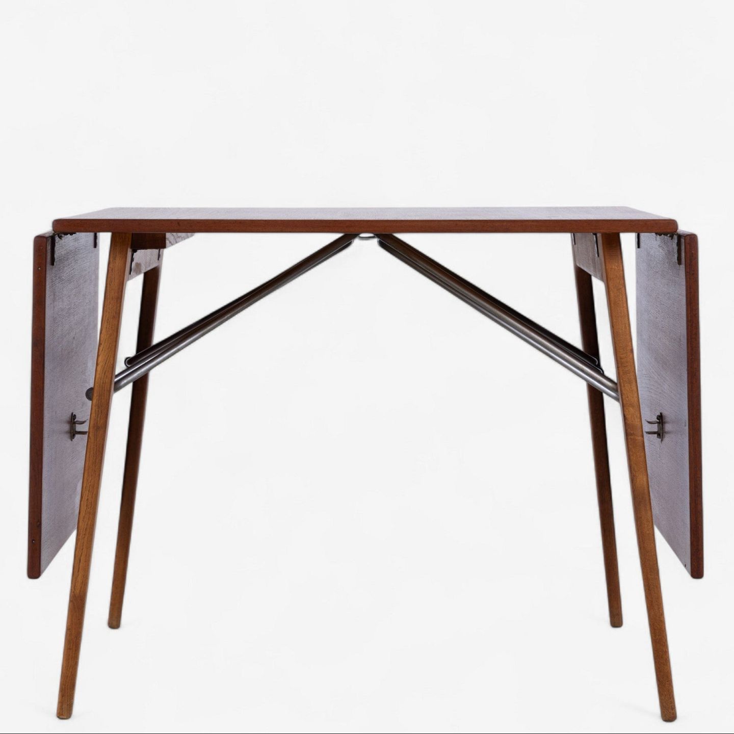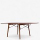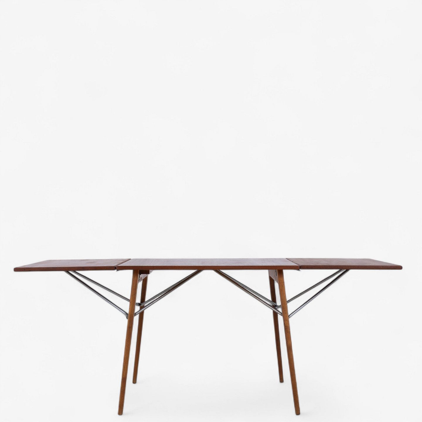 Spisebord med stel i massiv egetræ og top i teak med to tillægsplader.