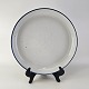 Beskrivelse: Rundt fad i stentøj med blå kant, jernpletter og hvid glasur