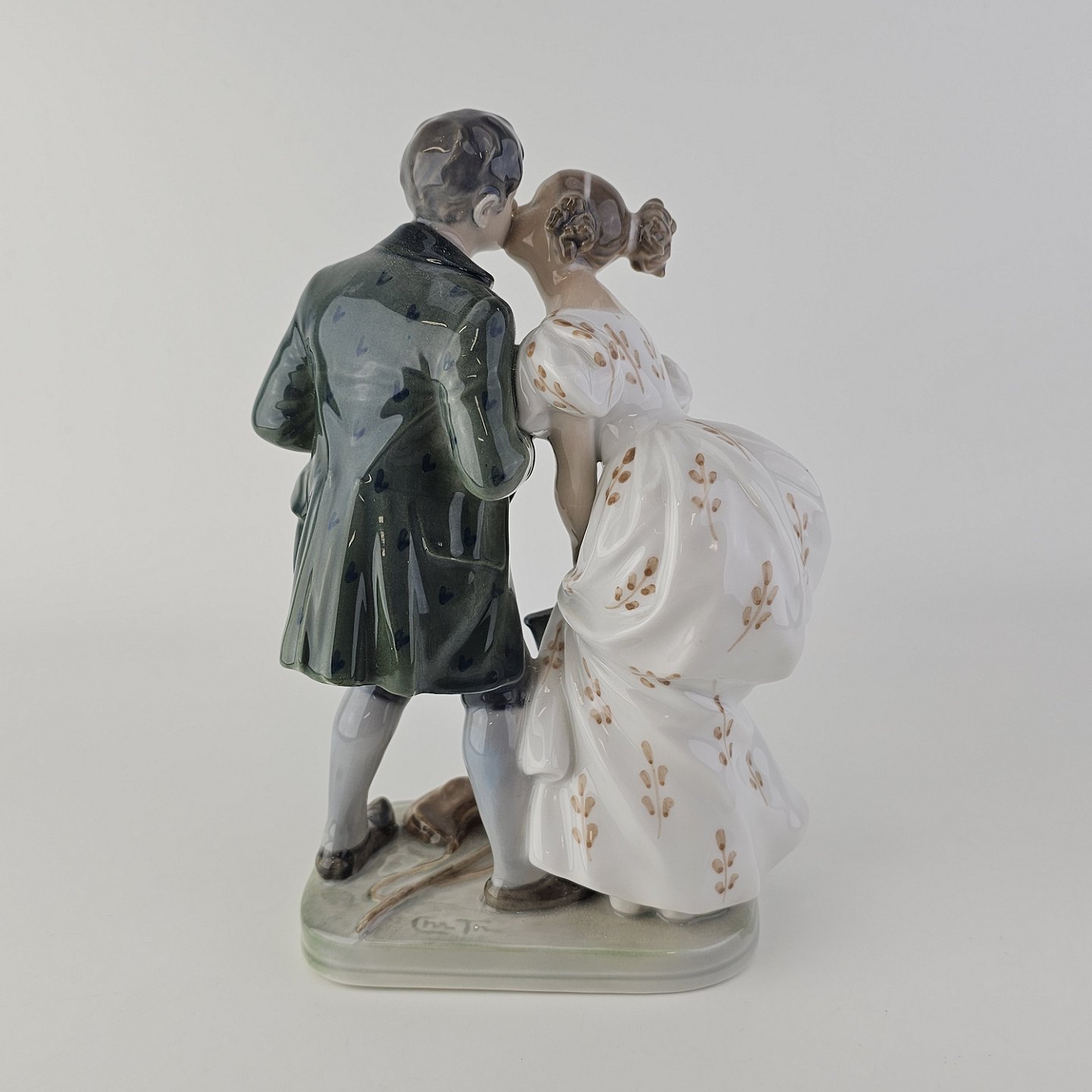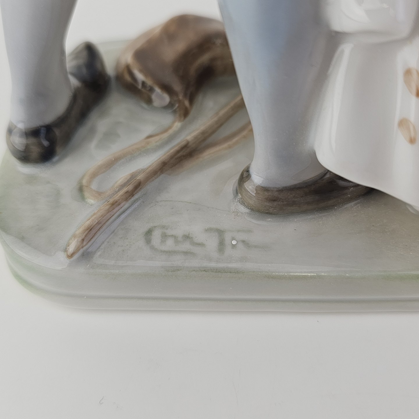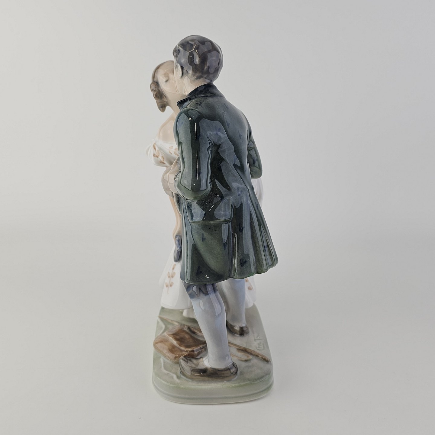Beskrivelse: Figur i kongeligt porcelæn med motiv af prinsessen og svinedrengen fra H.C. Andersens eventyr