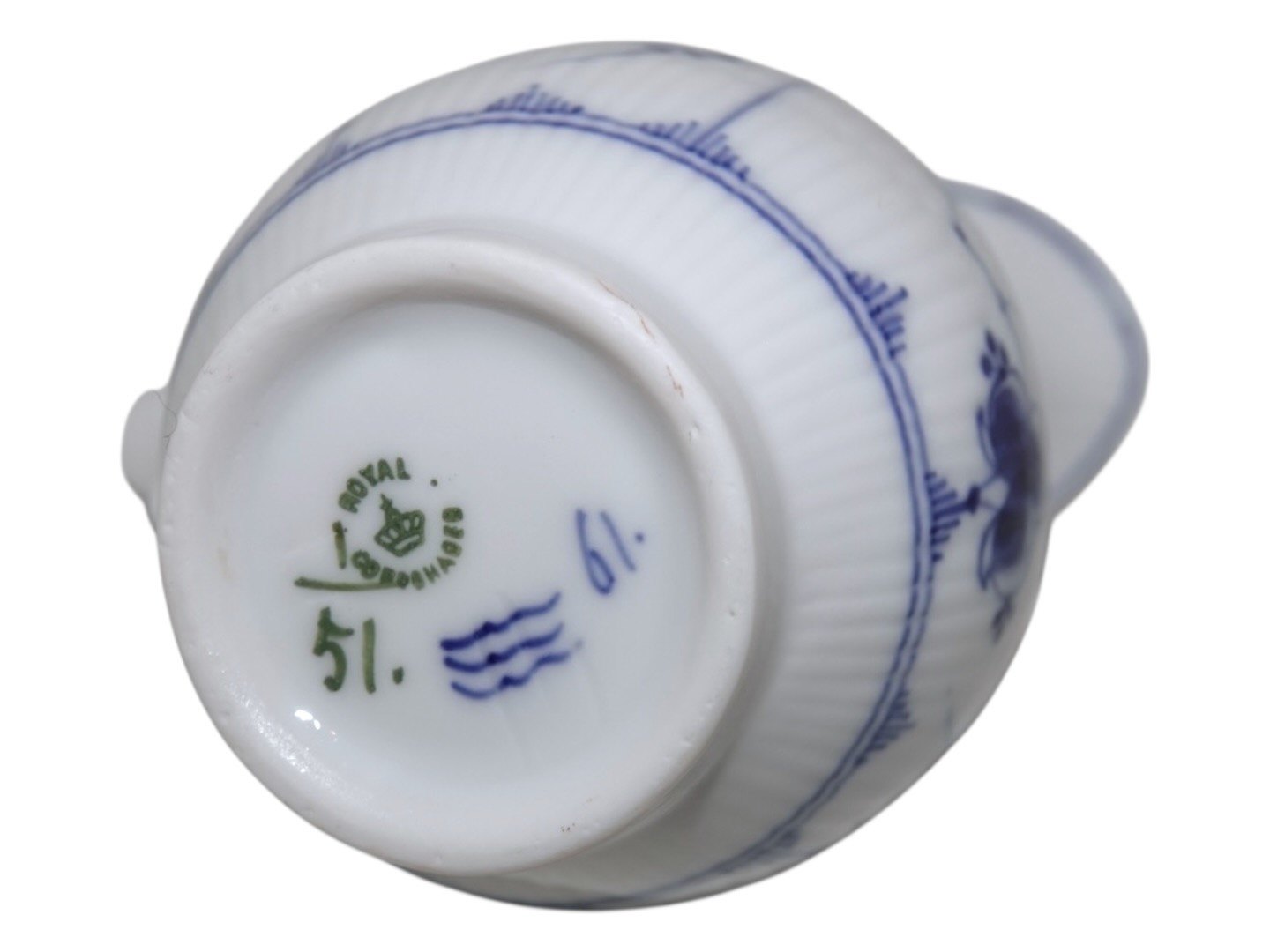 Beskrivelse: Royal Copenhagen Musselmalet Riflet, sjælden flødekande.