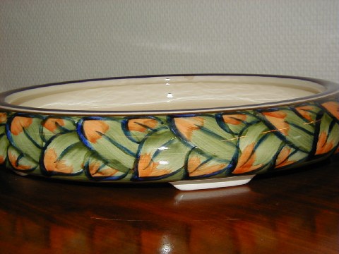Description: Large Aluminia Bowl, richly decorated, standsd on five feet, number 1288/1235, diameter 30.5 cm., perfect condition.