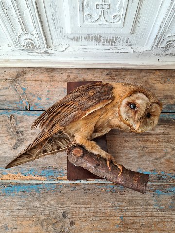 Udstoppet slørugle monteret på gren så den kan hænge på væggen
