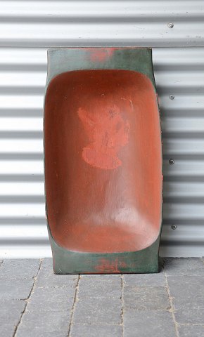 Stort antik træfad. Dekoreret i to farver. Udskåret i et stykke træ. Intakt og i pæn stand.