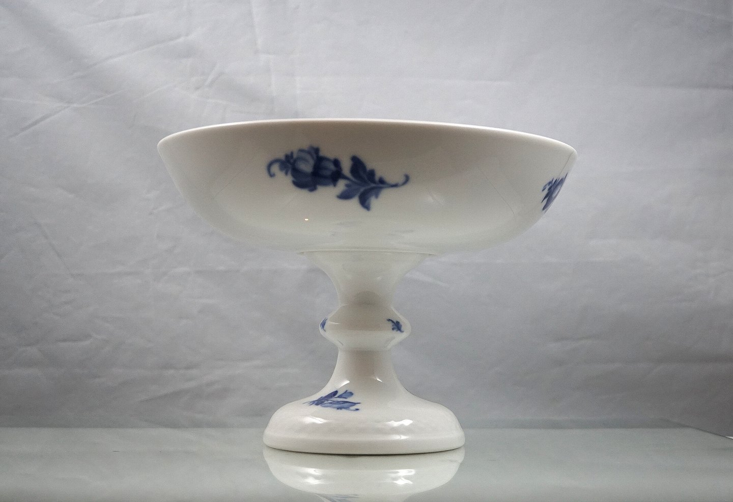 Royal Copenhagen. Blå blomst, nr 10/8064. Blå blomst, høj opsats med flettet kant. 1. sortering. Hver eneste buket er sammensat af maleren selv, efter plancher fra 1700-tallet. Royal Copenhagen begyndte at producere Blå Blomst i 1799, det blev stel nr 10. Produktionen ophørte i 2000