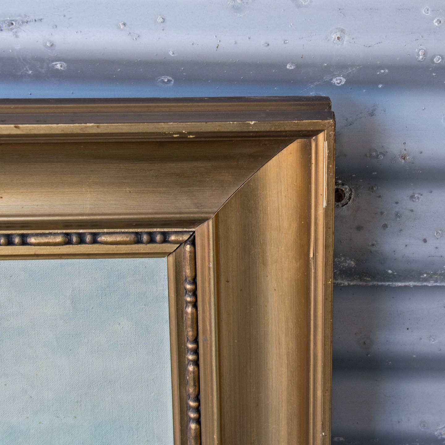 Maleri af 3 master sejlskib på hav, olie på lærred med guldramme
