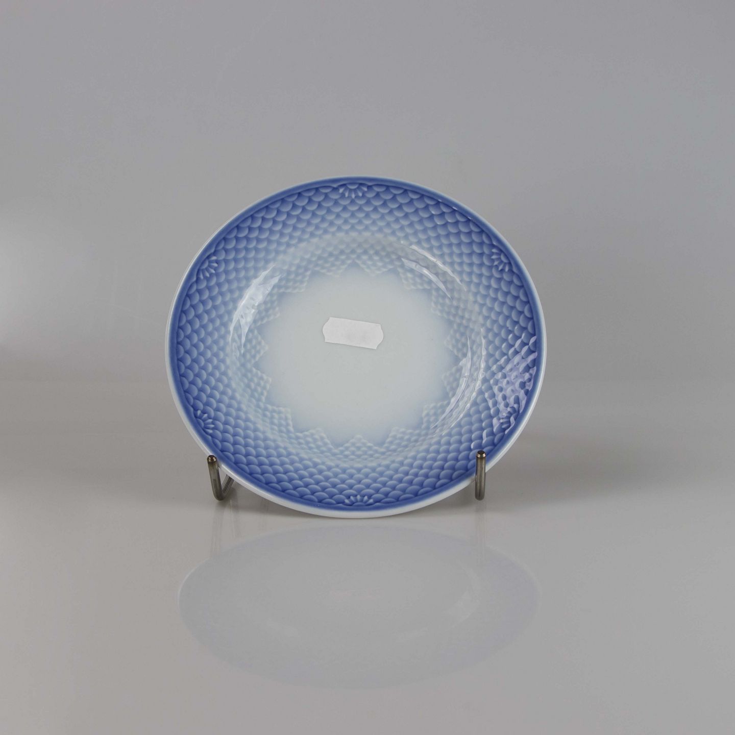 Tallerken fremstillet i hotelporcelæn med skelform i gradueret blå nuancer.