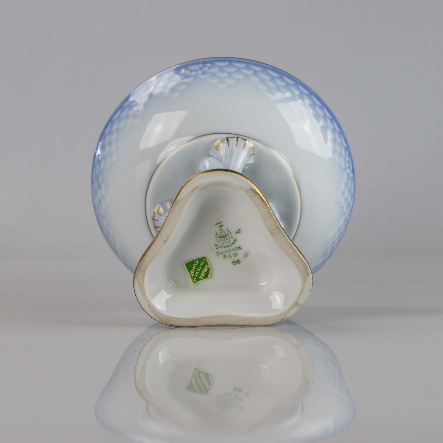 Opsats fremstillet i porcelæn med skelform i gradueret blå nuancer med guldkant samt motiv af måge.