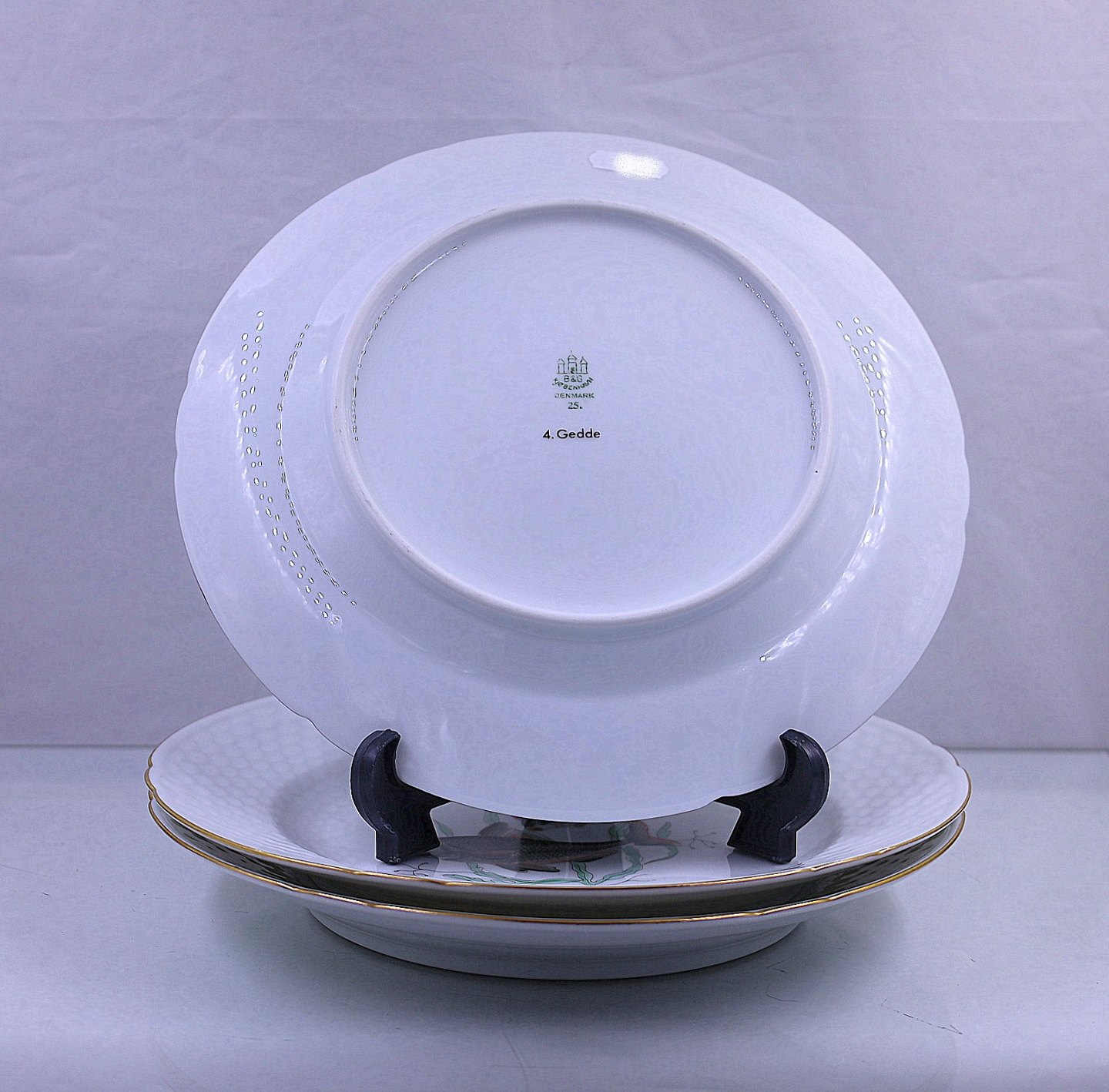 Bing & Grøndahl Hostrup. Fisketallerken, nr. 25. Motivet er 4. Gedde (Esox lucius). Tallerkenen er af hvidt porcelæn med skelkant og guldkant.