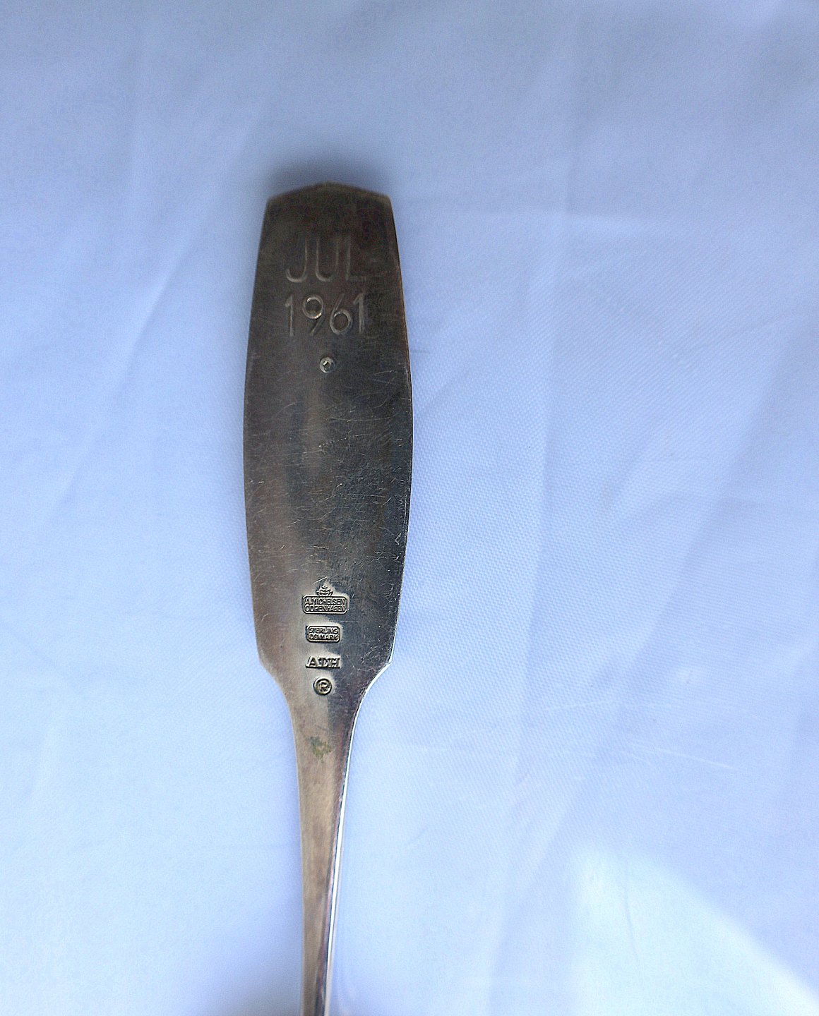 Anton Michelsen juleske 1961. Skeen er forgyldt sølv, dekorationen er orgelpiber i blå emalje.