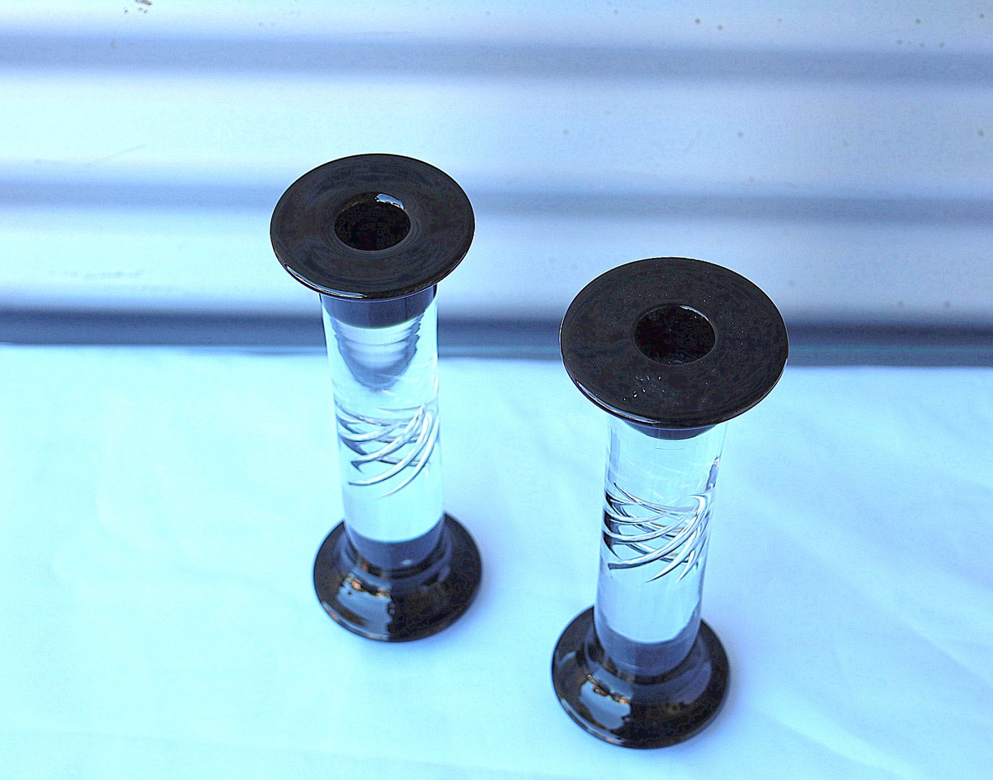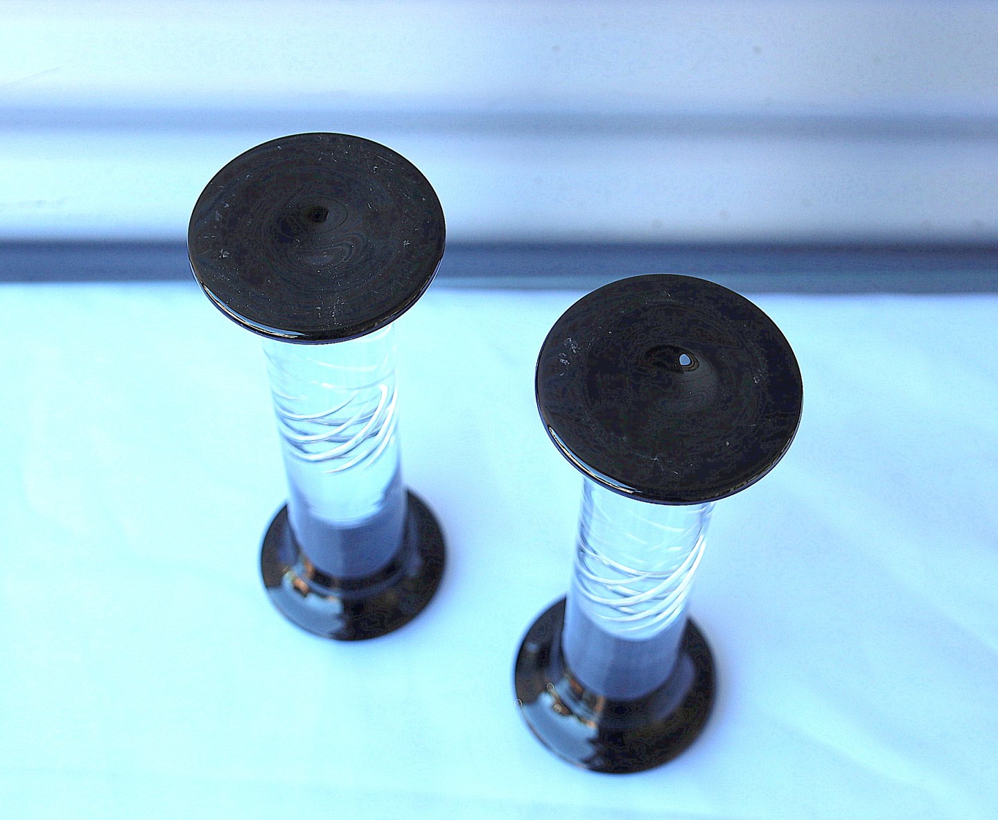 Holmegaard Glasværk. Lysestager, High Life. Lysestagerne er klare med bund og top af sort opalglas, på stagerne er der, midt på, indvendige snoninger.